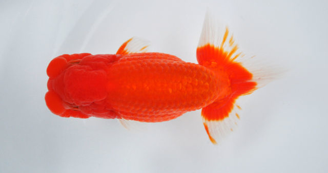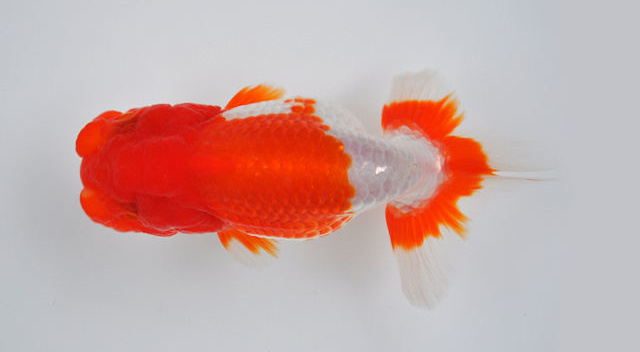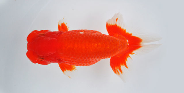 取締2 神奈川新聞社賞 横浜 福元氏持魚 目幅が十分にあり、腰白模様で、尾の配色の赤が白色洗面器で引き立っている。 |
