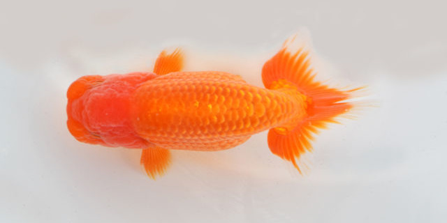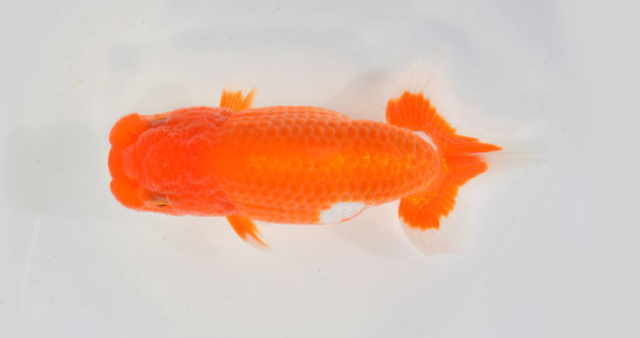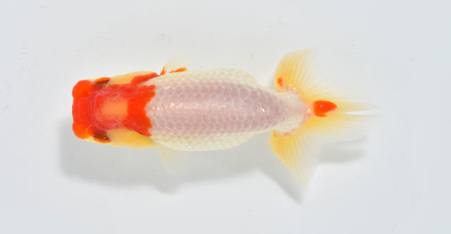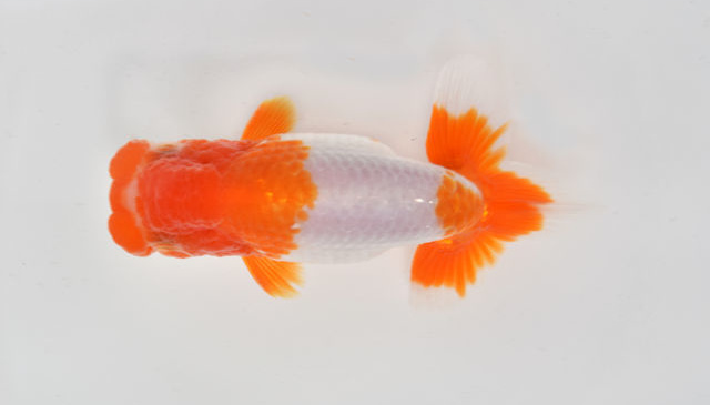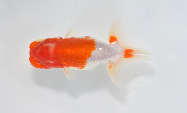 東大関 横浜市長賞 横浜 武井氏持魚 中長な魚で頭のふんたんが上を向いている。体の白色が美しく、尾心の赤1点は見事。 |