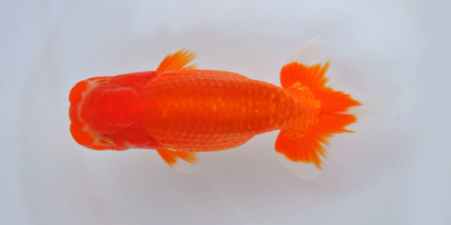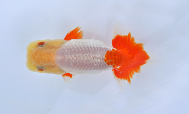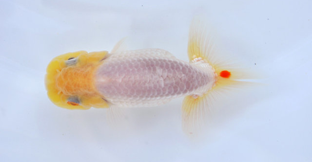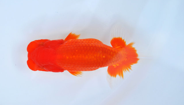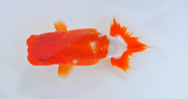 立行司 読売新聞社賞 平塚 江原尊仁氏持魚 素赤魚で、上位魚と異なり、派手さはないが、体形が箱形で遊泳が上手。頭の獅子頭も魅力十分。 |